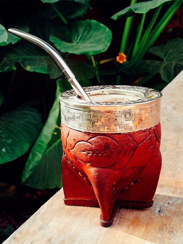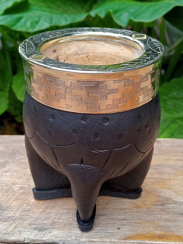 Este mate está hecho con calabaza brasilera natural, forrado en cuero vacuno repujado a mano y apoyado sobre cuatro patas, brindando firmeza y carácter.