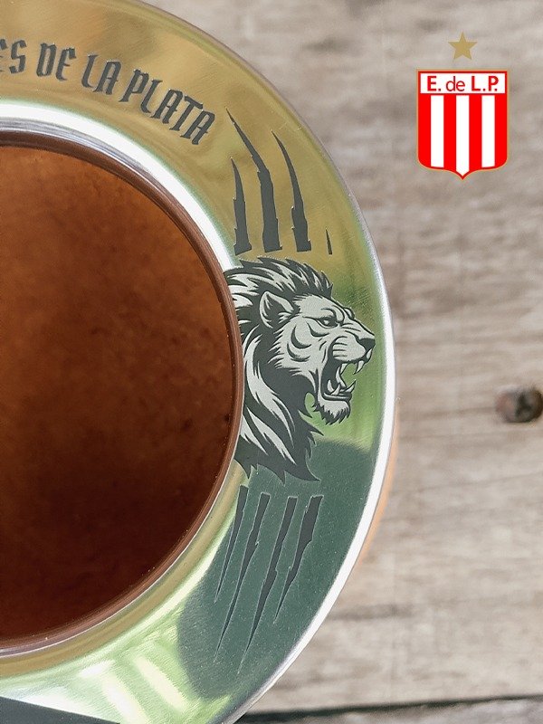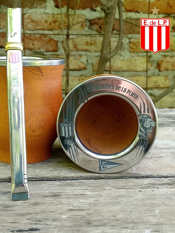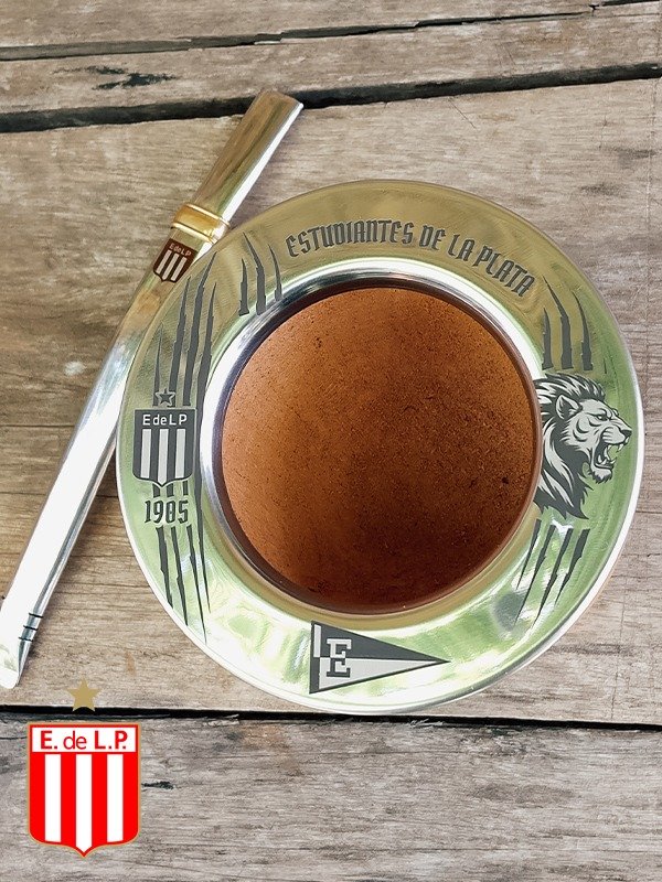 • El mate incluye bombilla pico curva de acero inoxidable chata con dije de bronce grabado con escudo de ESTUDIANTES a color.