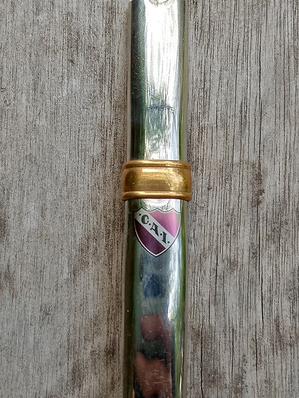 • El mate Incluye Bombilla pico curva de acero inoxidable chata con dije de bronce, grabado con escudo a color.