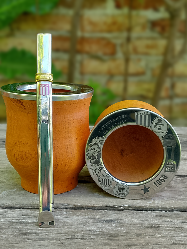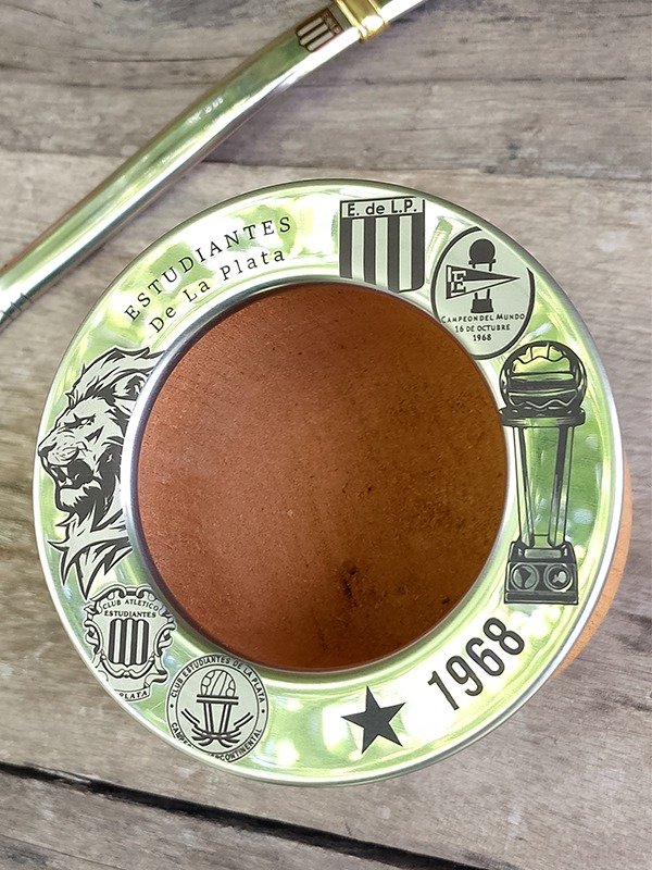 • El mate incluye bombilla pico curva de acero inoxidable chata con dije de bronce grabado con escudo de ESTUDIANTES a color.
