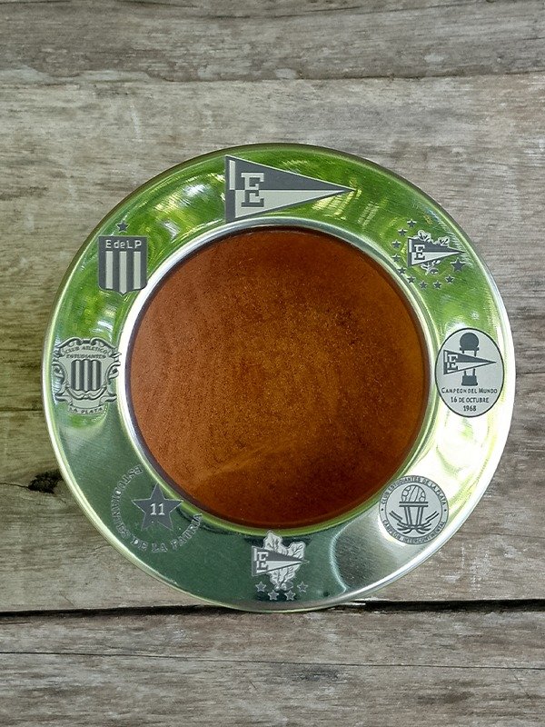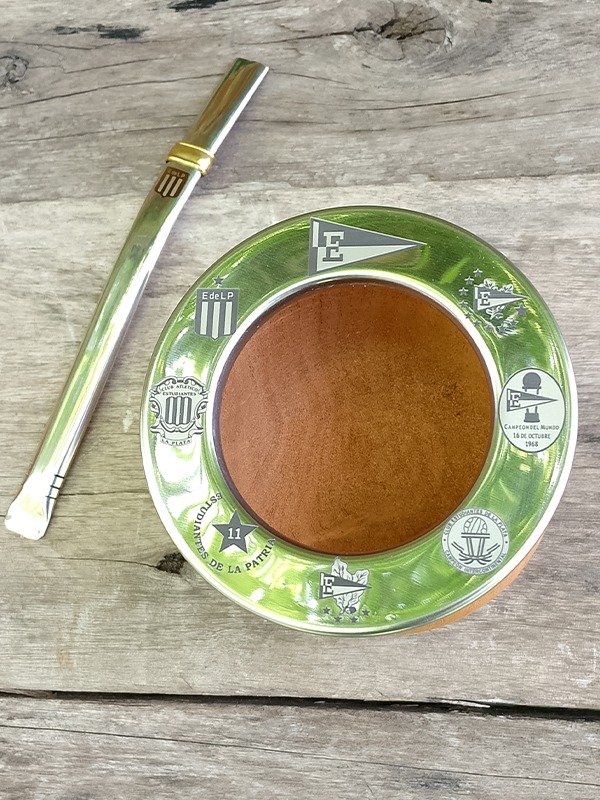 • El mate incluye bombilla pico curva de acero inoxidable chata con dije de bronce grabado con escudo de ESTUDIANTES a color.