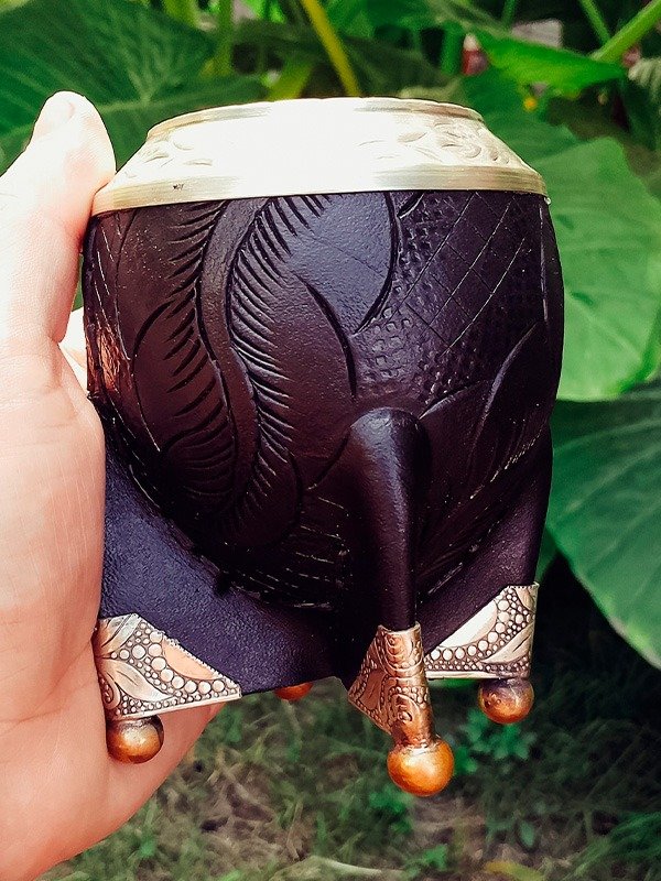 La virola de alpaca cincelada a mano aporta un toque artesanal de alta calidad, mientras que la base esquinera en alpaca y terminaciones en esferas de bronce garantiza firmeza, durabilidad y distinción en cada cebada.