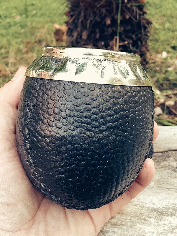 Este modelo Torpedo Criollo está confeccionado artesanalmente con calabaza seleccionada, revestido en cuero vacuno 100% premium estilo croco, con virola de alpaca cincelada a mano y una base forrada en cuero trabajado a juego, que le da mayor resistencia y carácter.