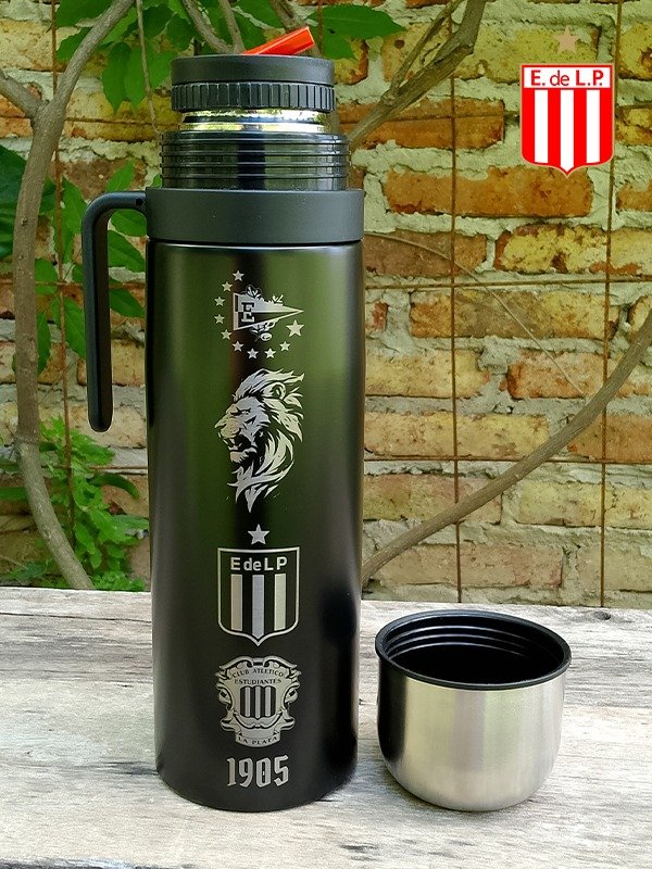 Termo Media Manija de Acero Inoxidable NEGRO (1L) diseño ESTUDIANTES DE LA PLATA